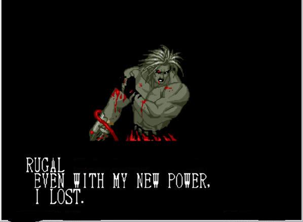 - Pilar de Orochi - El poder clásico de rugal, utiliza un ataque tipo agarre (se puede bloquear) con el cual lleva al oponente al otro lado de la pantalla, donde al estrellarlo aparece un rayo rojo vertical con una calavera. El poder de Súper desesperación lo aplica dos veces.